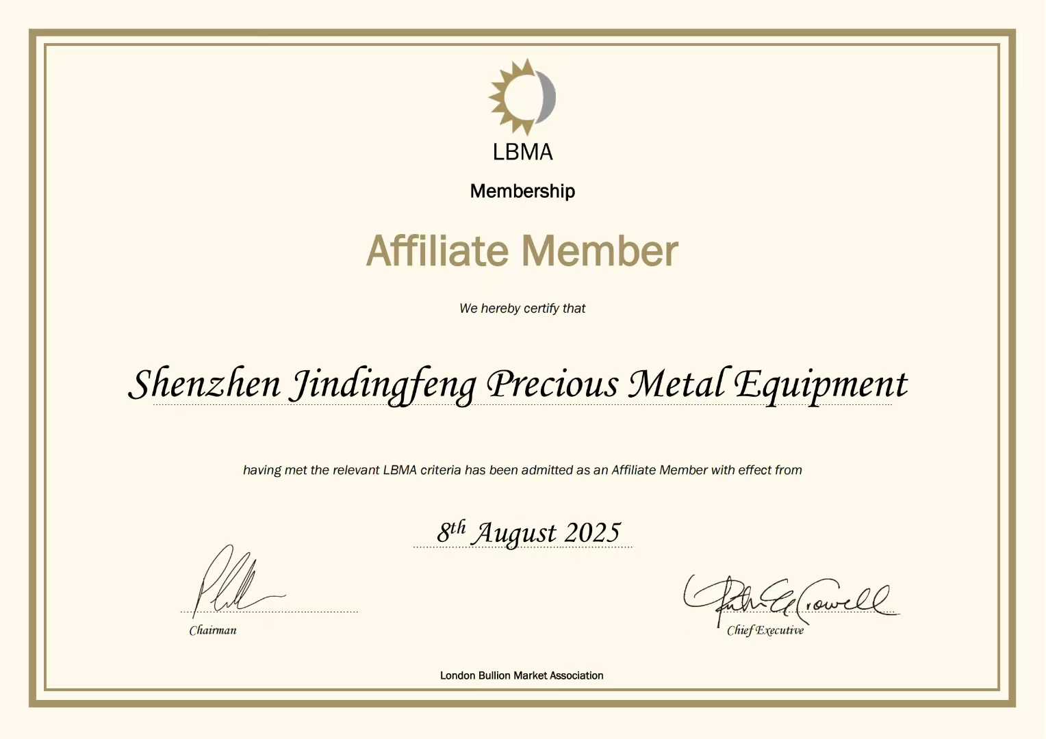 近日,深圳市金鼎丰贵金属设备科技有限公司正式通过伦敦金银市场协会(LBMA)认证,成功跻身国际贵金属设备合格供应商行列。这标志着金鼎丰在技术工艺、产品质量与管理体系等方面均达到国际权威标准,为企业拓展全球市场、深化行业合作奠定了坚实基础